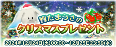| イベント期間中、 大梁商店街に「雪たまうさ」が登場します。 「雪たまうさ」に話しかけると、1キャラクターにつき1回のみ、 「クリスマスプレゼントボックス」を受け取る事ができます。 |